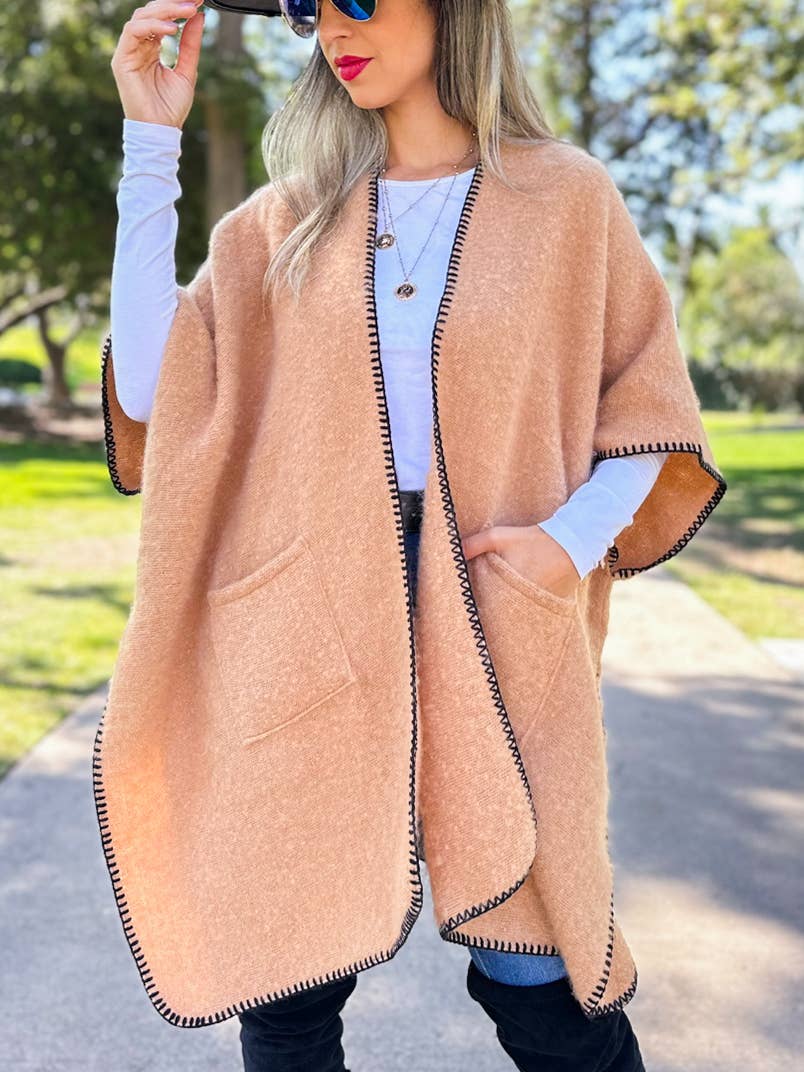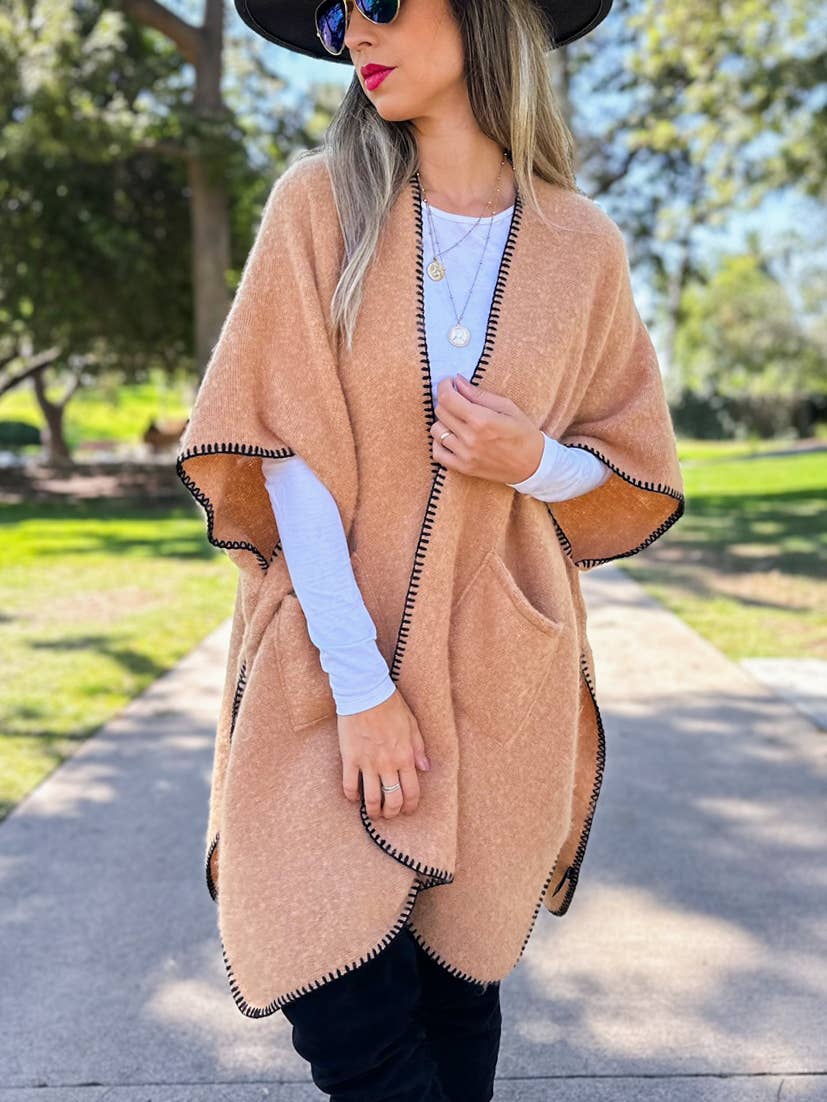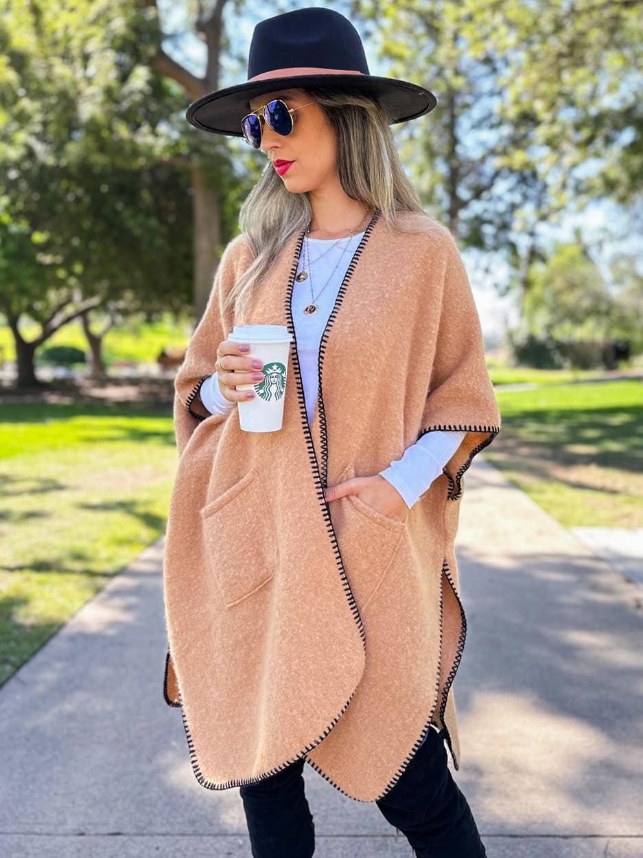 Style: Open-front ruana with a minimalist and refined design, enhanced with unique stitch detailing.