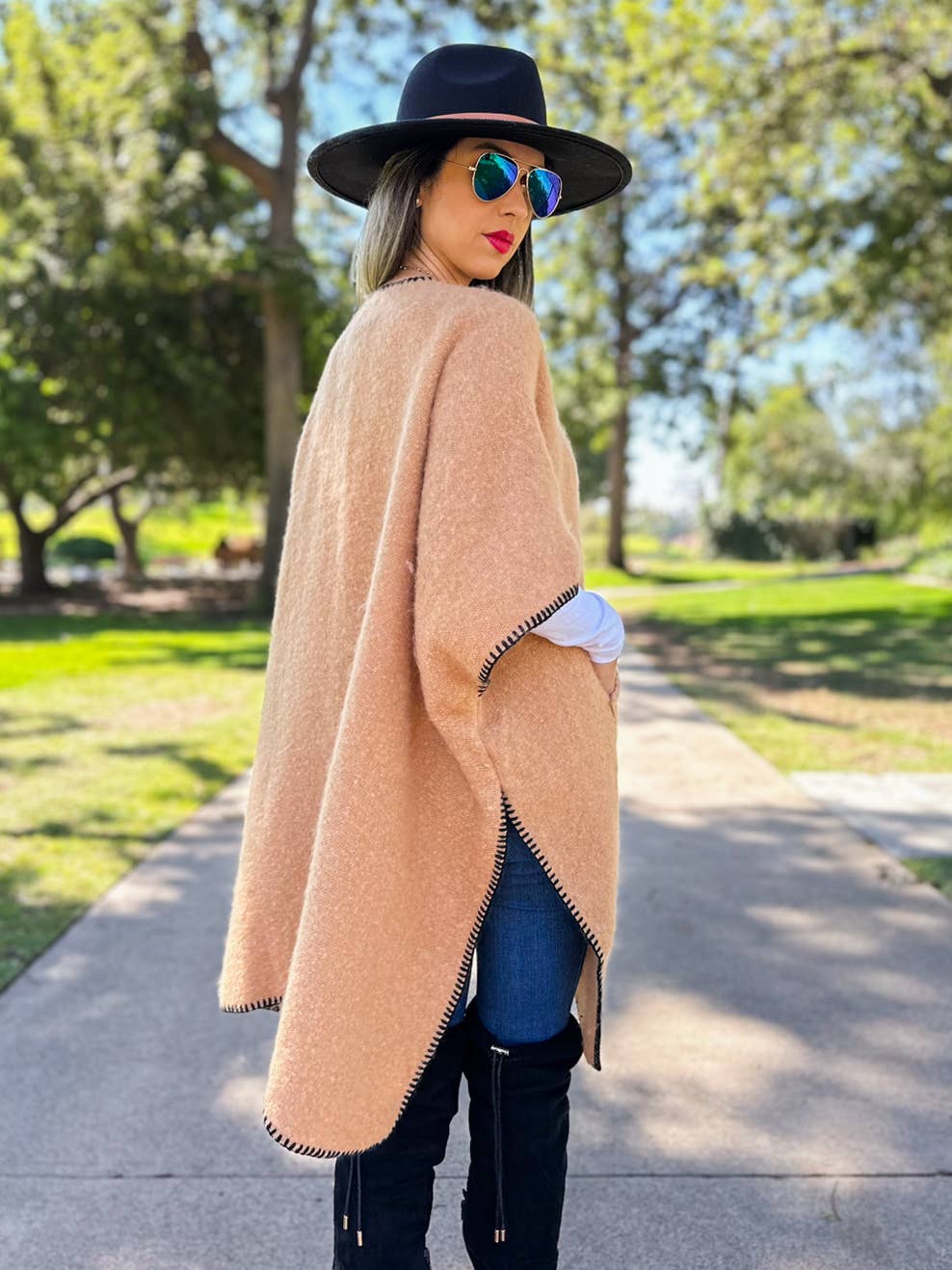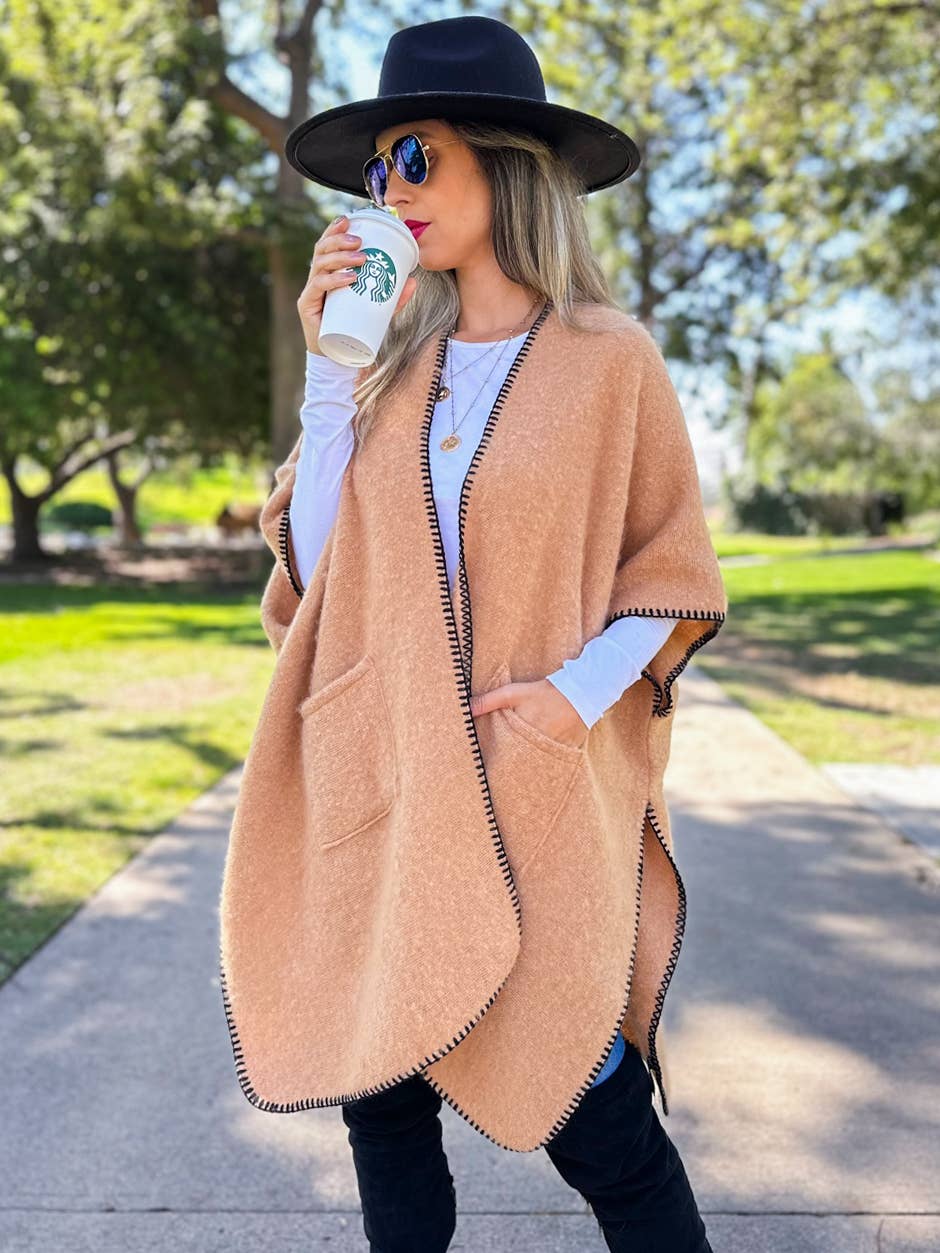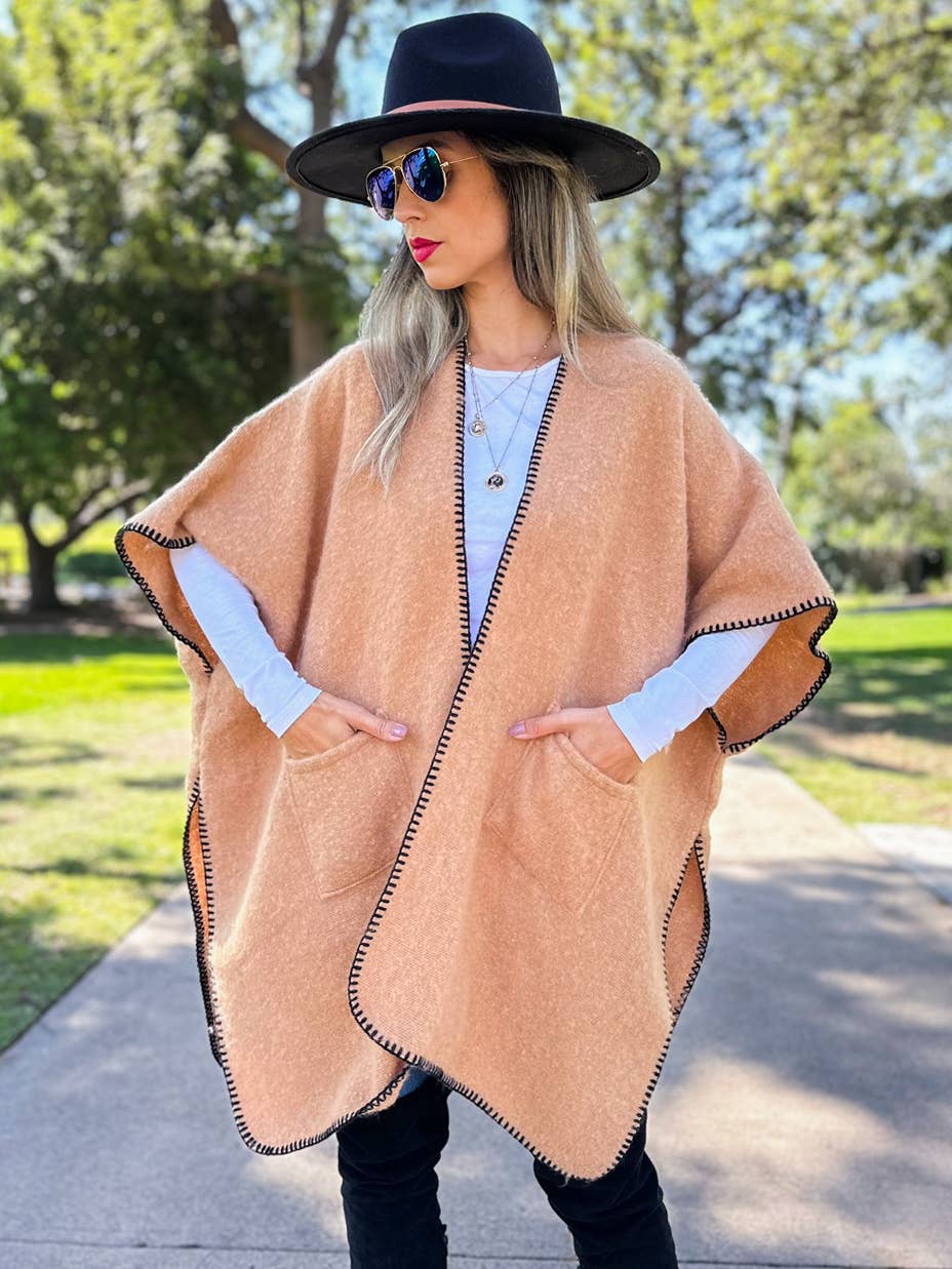 Style: Open-front ruana with a minimalist and refined design, enhanced with unique stitch detailing.