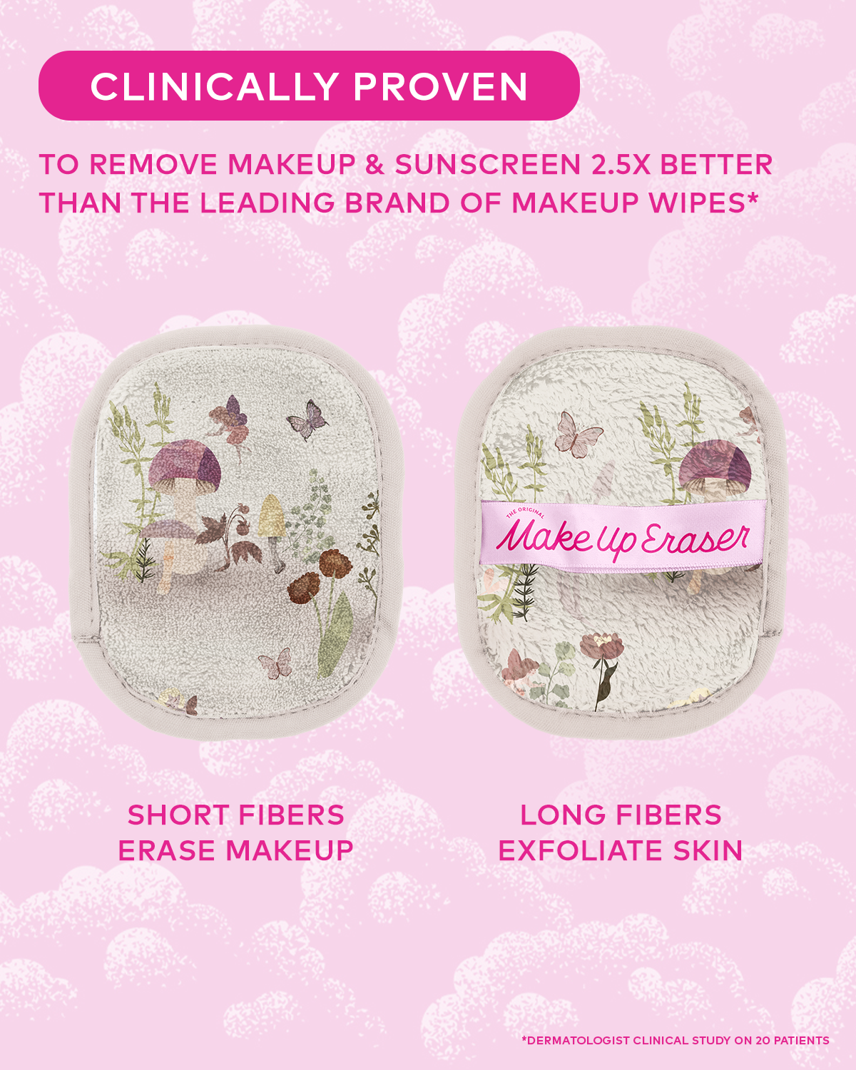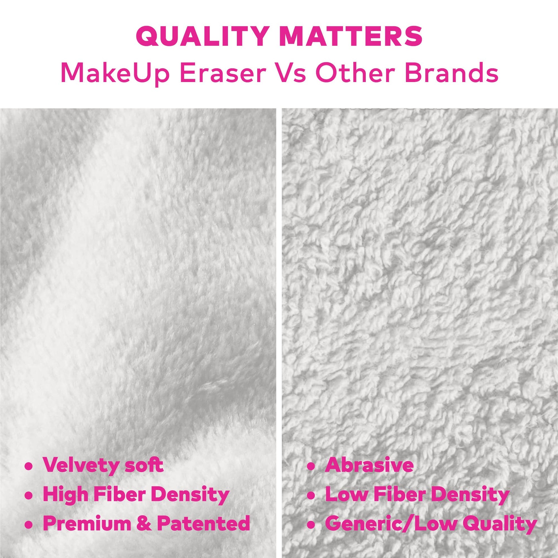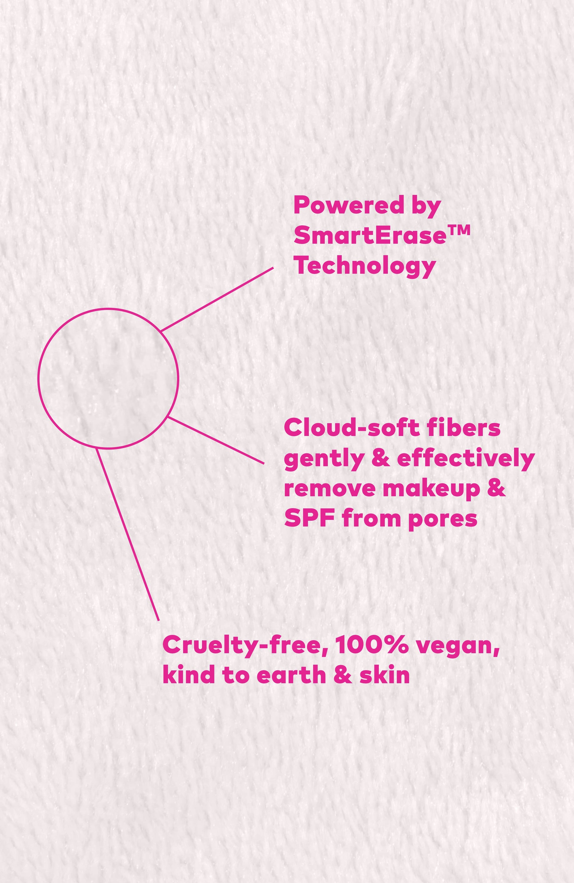 MakeUp Eraser is powered by SmartErase™ Technology, featuring unique cross-section microfibers engineered for efficient makeup removal using electrostatic forces, & enhanced when wet. This innovation also allows for easy stain removal with machine washing.
