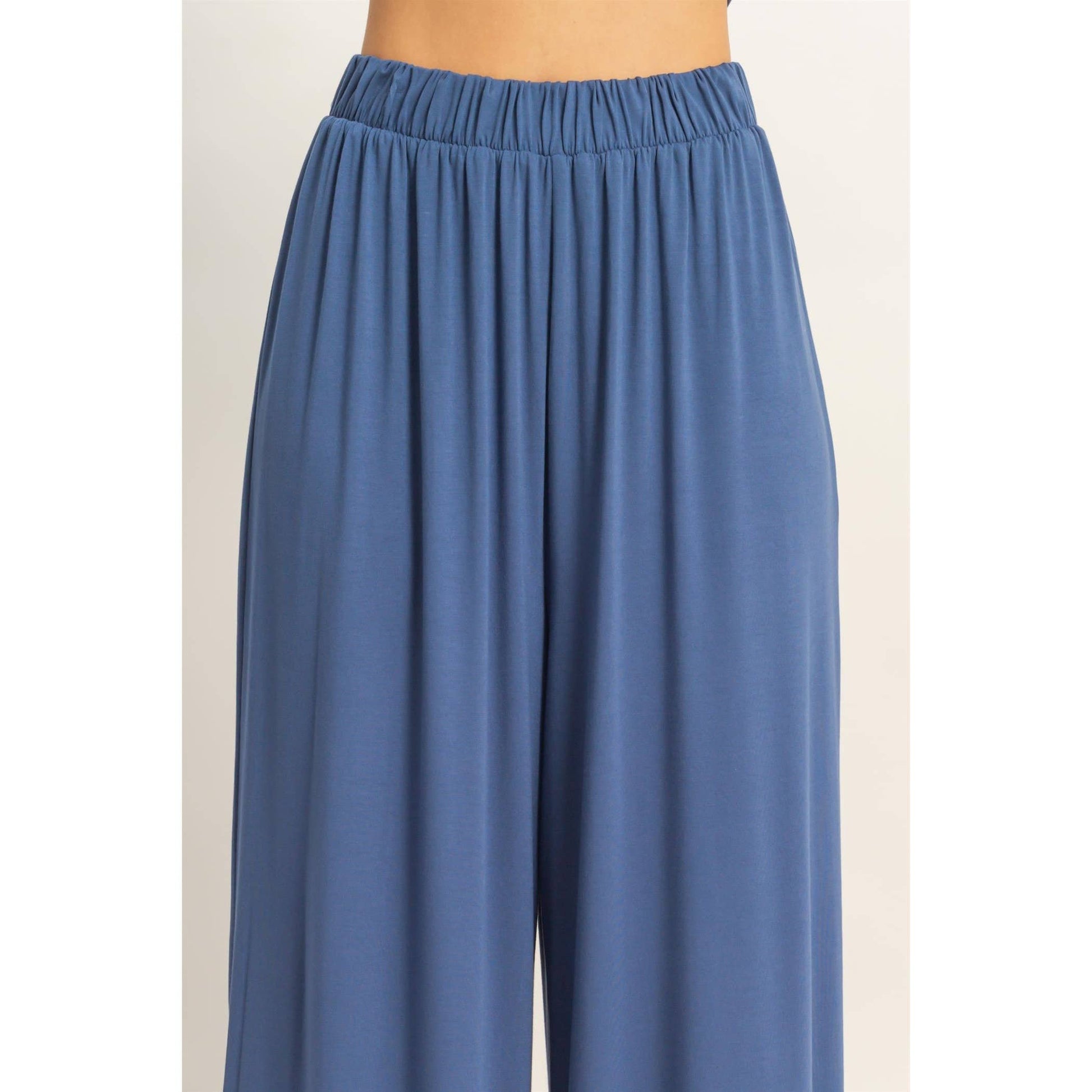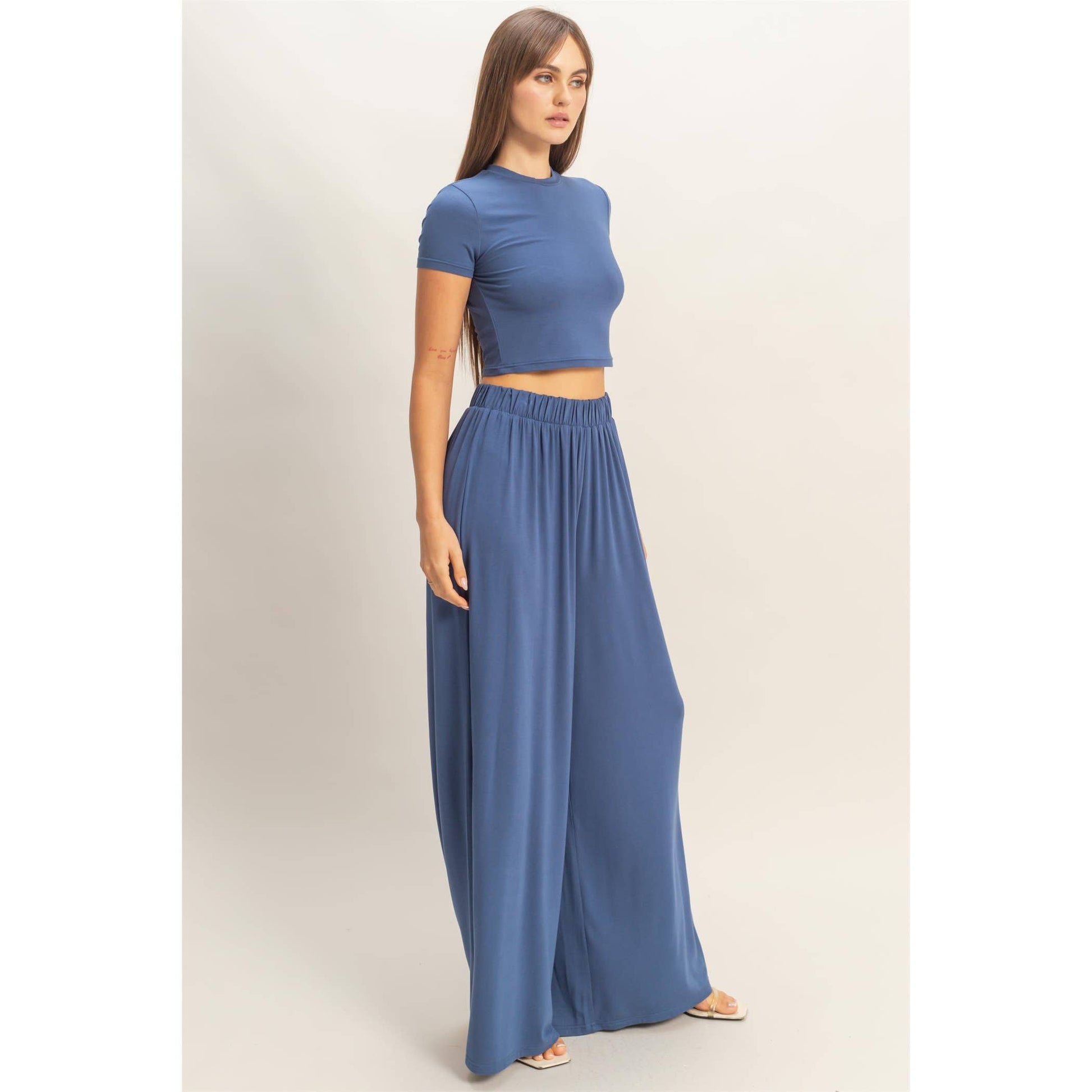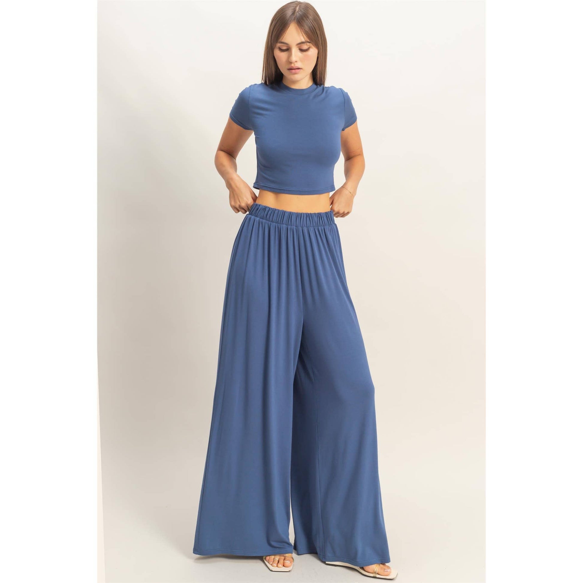 This versatile 2-piece set includes a short-sleeve crop top and wide-leg pants with an elastic waistband. Pair it with statement accessories for a chic look. 95% rayon 5% spandex Model Is 5' 8" Tall, 30" Chest, 25" Waist, 35" Hips And Wearing A Size Small Imported. Designed In The USA